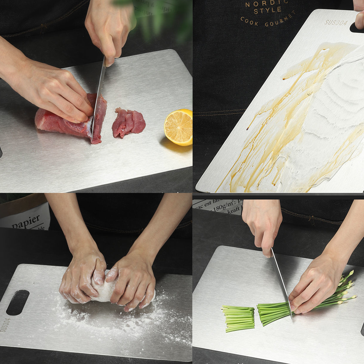 Crafted from premium 316 stainless steel, this cutting board combines durability with modern elegance. Its antibacterial and anti-mildew properties make it a safer choice compared to traditional wooden boards. Measuring 18.11 x 11.81 inch, it’s perfectly sized for family meals, offering ample space to chop meats and vegetables separately on its double-sided surface. The sleek handle ensures easy handling, while smooth edges and a non-slip pad provide stability and safety during use. At only 2 mm thick, this board is lightweight yet robust, with a sophisticated brushed metal finish. Ideal for kitchens seeking style and functionality, it also features a designated area for branding, making it a perfect promotional item for culinary enthusiasts.