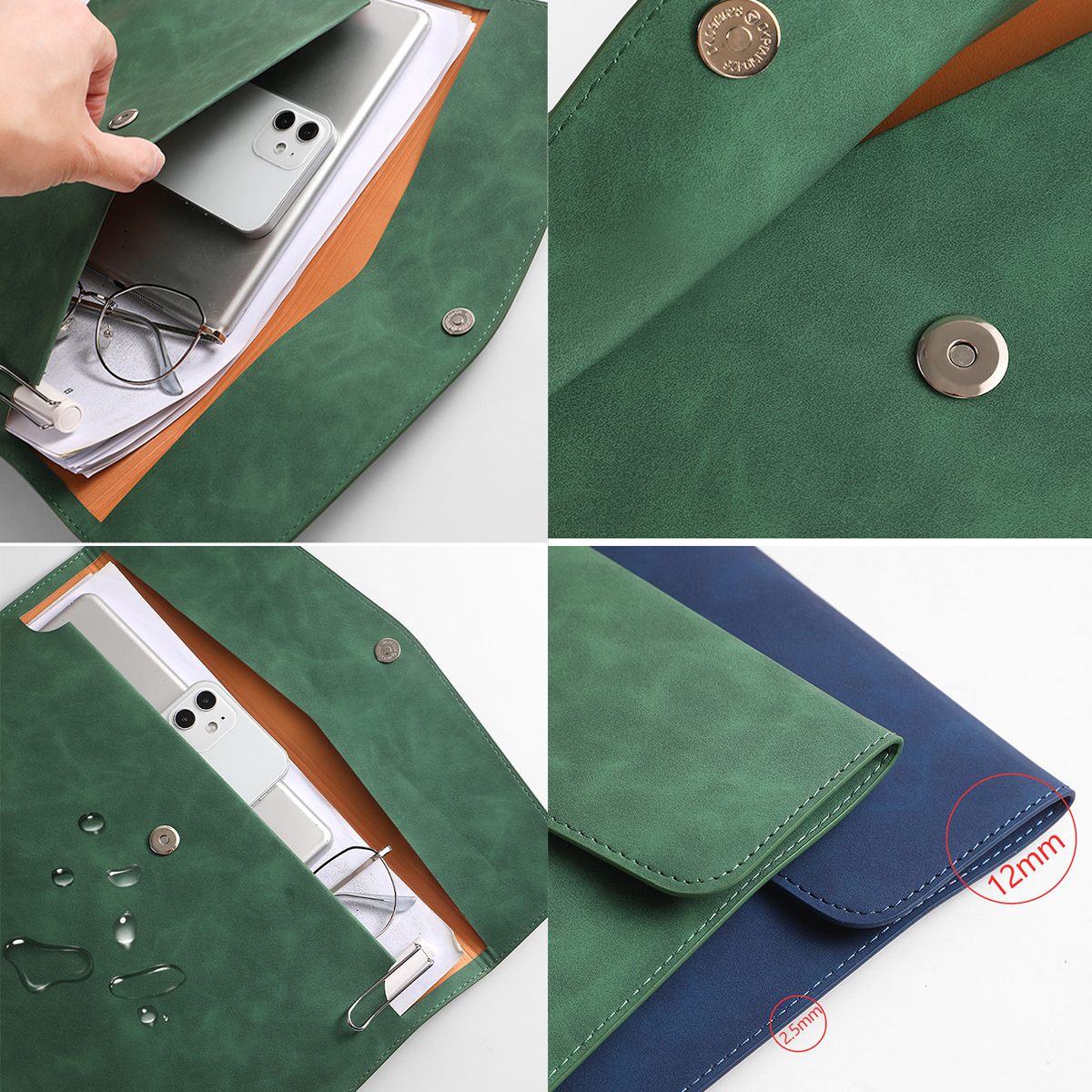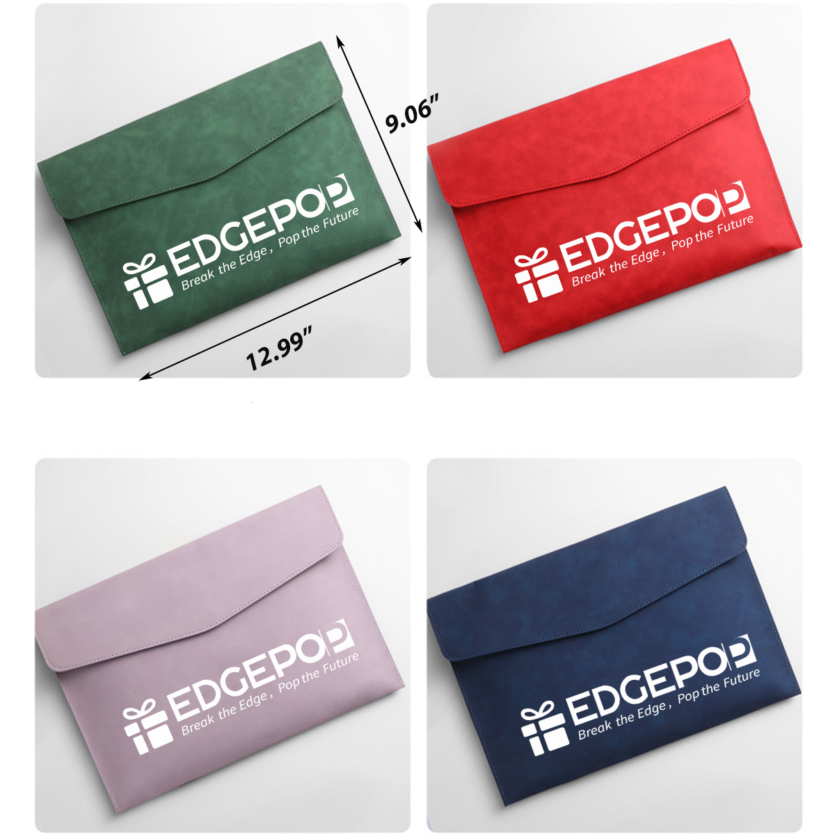 These stylish document pouches feature a convenient magnetic snap closure, ensuring quick access and secure storage. Crafted from soft-touch PU material, they provide a luxurious feel while offering water resistance to protect important papers from spills or light rain. Available in a spectrum of vibrant colors such as green, black, red, gray, and blue, these pouches can be customized with your company logo, making them perfect for promotional gifts. Ideal for both office use and on-the-go organization, they seamlessly blend functionality with modern style.
